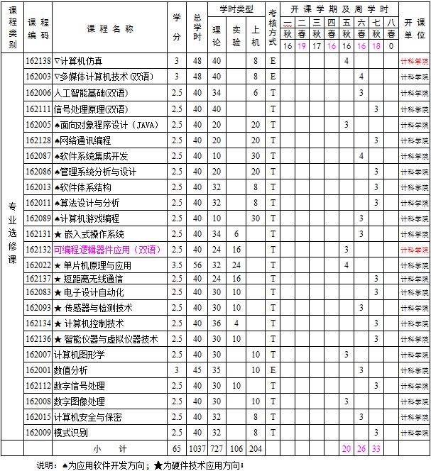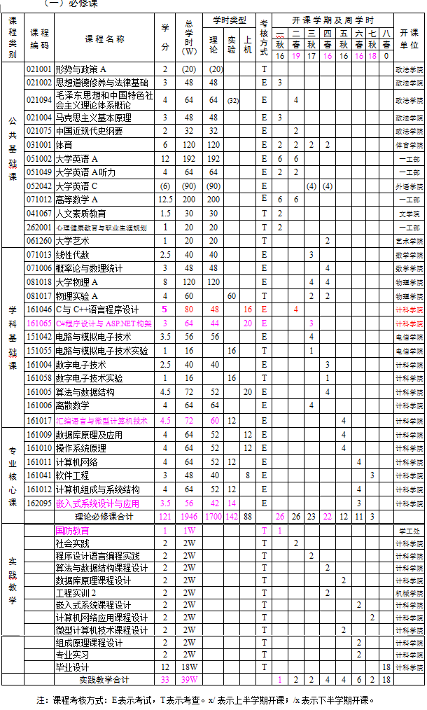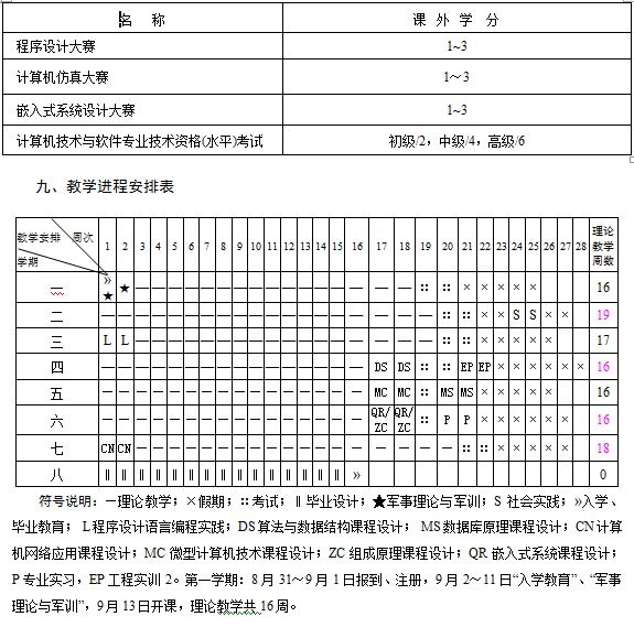 3.主要实践教学环节:军事理论与军训、社会实践、程序设计语言编程实践、算法与数据结构课程设计、计算机网络课程设计、微型计算机技术课程设计、组成原理课程设计、数据库原理课程设计、嵌入式原理及应用课程设计、专业实习、毕业设计。