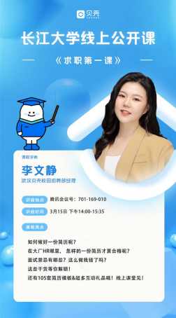 (通讯员 余珺瑞)2022年3月15日14:00,武汉贝壳找房科技有限公司校园招聘经理李文静受邀在腾讯会议为bevictor伟德员工开展就业指导讲座,公司2018级近四百名员工参加。