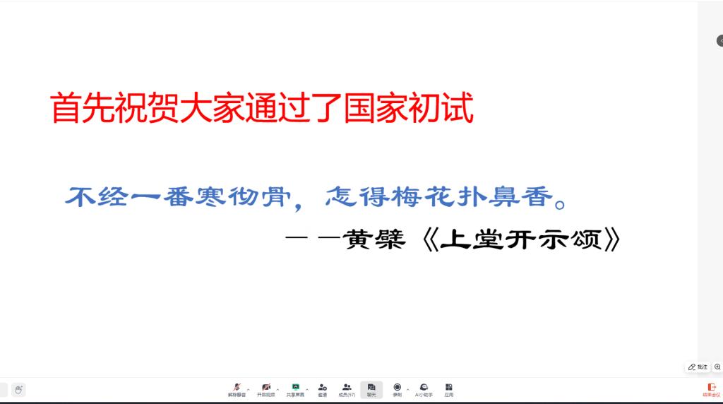 为精准提升考研学子复试竞争力,系统化解备考焦虑,3 月 14 日下午,公司成功举办“研途领航・决胜复试”专题指导讲座。本次活动由辅导员余珺瑞主持,公司党委副书记肖彬、经理助理雷鸣、2020 级优秀员工严思龙、余涛等嘉宾与 70 余名考研学子云端相聚,共话复试突围之道。 活动伊始,雷鸣老师以 "知己知彼,百战不殆" 为主题,从国家研究生扩招政策切入,结合近年招生数据,深度解析复试考察重点与评分标准。他特别强调 "调剂黄金期" 的关键策略,建议同学们构建 "保底+冲刺" 的复试方案矩阵,通过模拟面试、查找公司复试信息等方式提升面试成功率。 “复试是信息战更是心理战。”严思龙员工以自身复试经历为例,详细拆解复试全流程的 “避坑指南”。他建议学弟学妹们在专业问答中注重理论与实践相结合,在英语口语测试时保持 “自信而不自负” 的状态,并现场演示了科研经历介绍的话术技巧。 余涛学长则聚焦笔试面试的实战技巧,通过典型例题解析,揭秘 “高分答案”的底层逻辑。他特别提醒同学们注意细节把控,如毕业设计的严谨性表达等,并分享了独家整理的 "高频问题应答模板"。 在互动环节,学子们就 “英语翻译如何准备”、“面试突发状况应对”等热点问题踊跃提问,三位嘉宾逐一给予针对性指导。会后,2021 级员工崔秭威表示:“这场讲座就像及时雨,特别是调剂策略和面试话术部分,让我对复试更有信心了!” 据悉,公司将持续开展 “考研护航计划”,通过简历打磨、模拟面试等定制化服务,助力学子顺利跨越 “上岸最后一公里”。