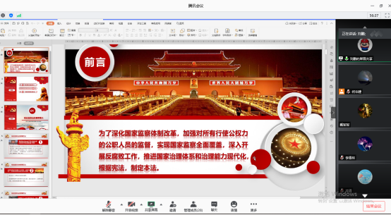 此次团会以线上形式,组织同学们观看《学习监察法,争做廉洁人》相关视频,并以“监察法”相关内容展开研讨,加深同学们对《监察法》的认识,强化同学们的廉洁思想意识;最后主持人向同学们推送监察法知识测试,并督促同学们完成。会议过程中同学们积极配合,踊跃发表自己的看法。