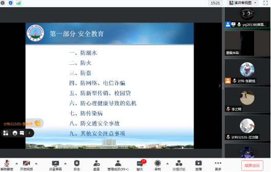 (通讯员:张颖旭)为切实做好常态化疫情防控下的2021年秋季新生开学教育工作,帮助和引导新生全面了解公司及公司的整体防控工作,2021年8月22日晚19:00,bevictor伟德利用腾讯会议(分两个会场),召开以“梦想起航,安全至上”为主题的安全教育班会。参加此次会议的有计算机科学公司党委副书记颜学俊、21级辅导员张颖旭、兼职辅导员高小梅、新生班级班主任、21级全体新生及部分新生家长。