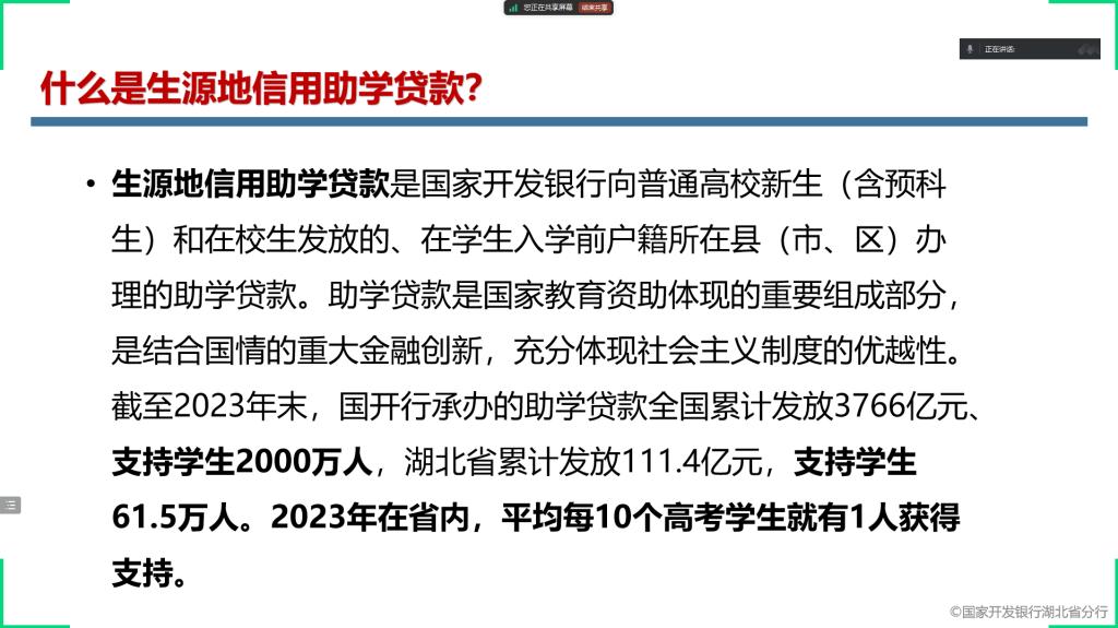 为深入贯彻落实国家资助政策,帮助家庭经济困难员工及家长全面了解生源地信用助学贷款相关事宜,确保家庭经济困难员工能够顺利入学并完成学业,bevictor伟德于9月15日在腾讯会议组织开展了2024-2025学年秋季学期生源地信用助学贷款政策宣讲活动。 活动伊始,公司负责资助工作的王鹏翔老师对生源地信用助学贷款政策进行了详细解读。围绕生源地信用助学贷款的申请条件、贷款额度、贷款期限、利息计算、还款方式以及申请流程等关键内容一一展开介绍。用通俗易懂的语言和生动具体的案例,深入浅出地为同学们答疑解惑,确保每一位在场同学都能清晰准确地理解政策细节。 除了对政策的宣讲与答疑,王鹏翔老师在活动中着重强调了资助育人的重要意义。指出生源地信用助学贷款不仅仅是一项经济援助政策,更是国家助力寒门学子实现梦想、成长成才的有力举措,希望同学们能够心怀感恩之心,珍惜来之不易的学习机会,在今后的学习生活中勤奋努力、积极进取,以优异的成绩回报国家和社会的关爱,将来也能够将这份爱心传递下去,去帮助更多有需要的人,真正将资助化作成长路上的动力,努力肩负起时代赋予的责任与使命。 此次生源地信用助学贷款政策宣讲活动,是2024-2025学年秋季学期资助育人工作的重要一环,通过活动的开展,进一步加大了国家资助政策的宣传力度,使更多员工受益于生源地信用助学贷款政策,同时也在员工心中种下了感恩与担当的种子,为公司后续资助育人工作的深入推进奠定了坚实基础。