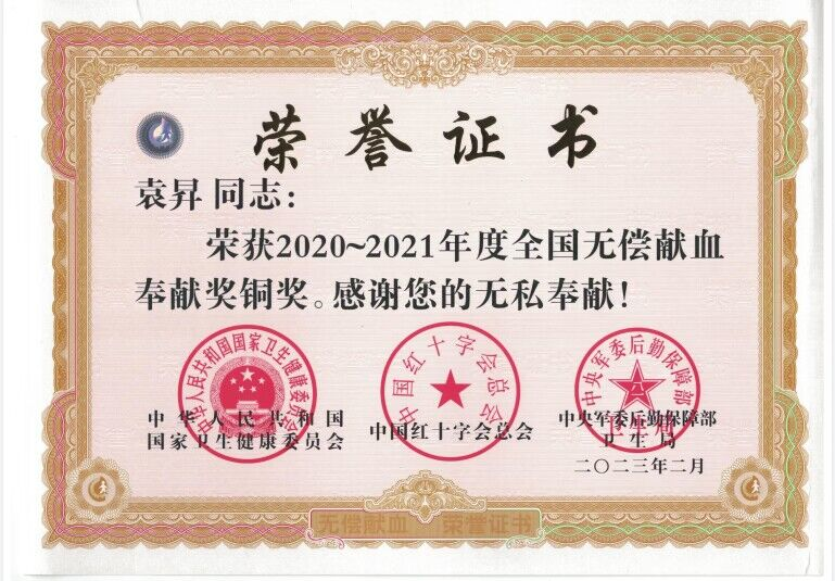 2023年,国家卫生健康委、中国红十字会总会、中央军委后勤保障部卫生局颁布《关于表彰2020-2021年度全国无偿献血表彰奖励获奖者的决定》,公司2021级员工袁昇荣获全国“无偿献血奉献奖铜奖”。