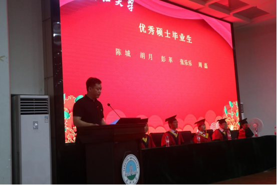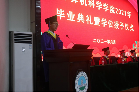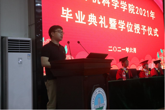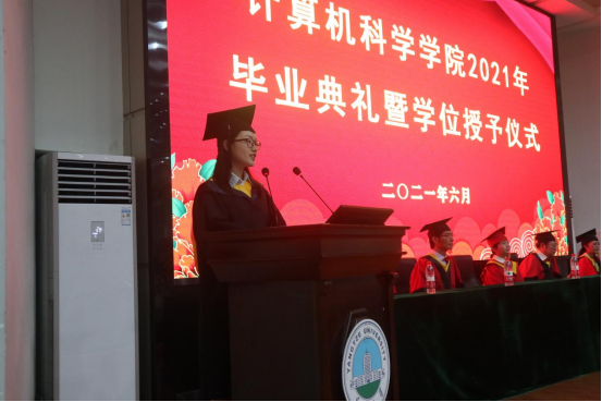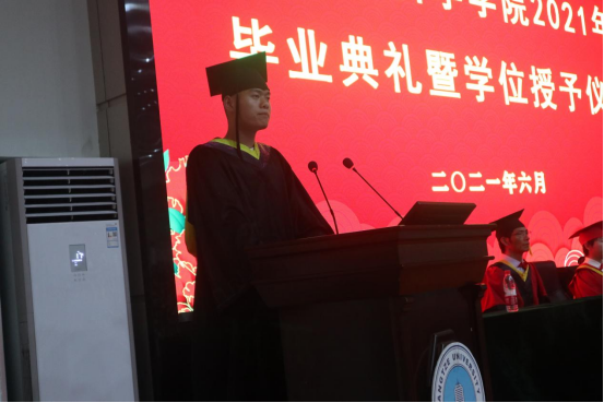 随后,公司本科生、研究生毕业代表依次上台发言。董阿兵谈到了这四年来大家的进步:我们努力践行“长大长新”的校训,学会了去求知,去探索,去宽容,不断超越,不断成长;卞珍怡回顾了在校历程,并深深地感谢父母、感谢导师、感谢同学;胡月像论文一样给自己三年的时光添加了两个关键词—“不舍”、“感激”,表达了自己对母校深深的眷念之情。