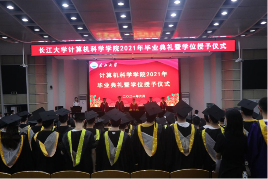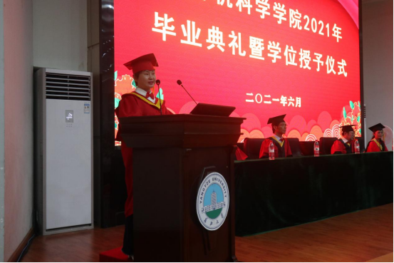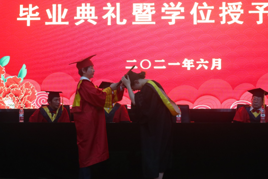 在毕业生学位授予仪式环节,身穿学位服的硕士毕业生、本科毕业生依次走上主席台,崔艳荣教授为每一位毕业生扶苏拨穗、授予学位、颁发证书。最后,公司毕业典礼在一曲带着离别思绪的《毕业歌》中结束。