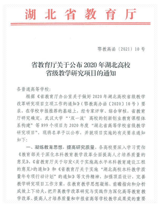 近日,湖北省教育厅印发了《省教育厅关于公布2020年湖北高校省级教学研究项目的通知》(鄂教高函[2021]10号),bevictor伟德共获3项,获批立项数创下近10年来一次性立项数新高。