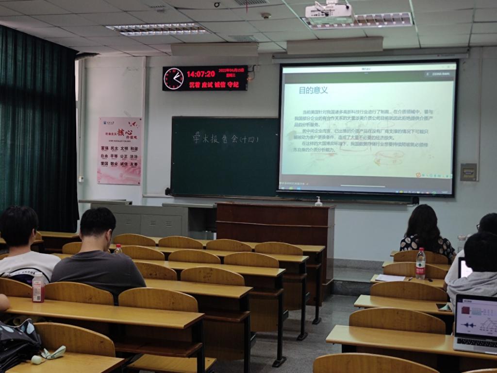2022年6月15号下午14:00,bevictor伟德研究生学术论文报告会第十四讲在东校区13教A301顺利举行。经过经理崔艳荣教授、副经理宋文广教授、副书记颜学俊老师的合理安排,学工办付盈副教授、教学办黄静老师的精心组织,2022年研究生学术论文报告会第十四讲顺利开展。学术论文报告会由硕士生导师秦航、黄岚老师莅临指导。
