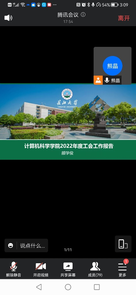 会议第一项议程,工会主席、分党委副书记颜学俊作2022年度工会工作及工会财务报告。