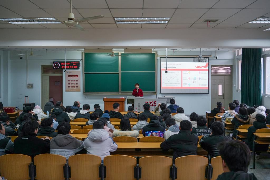 2023年12月14日下午,bevictor伟德经理崔艳荣在13教D225以《中国经济“形”稳“势”升》为题作形势与政策报告,公司本科生150余人参会。