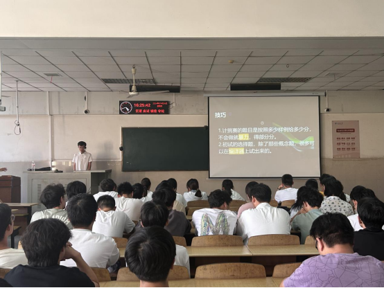 计科12101班韩琪琨向同学们分享了计挑赛python组比赛经验和学习方法。他强调:“在准备竞赛过程要多做题、多思考,只有通过不断练习和思考,才能对题型熟悉,将知识吸收,在竞赛中游刃有余,取得优异的成绩”。他还推荐了针对基础学习的菜鸟教程和刷题平台leetcode以及PTA天梯杯题单。最后鼓励同学们积极参加竞赛,不仅能锻炼编程能力,还可以提前为推免考研做准备。