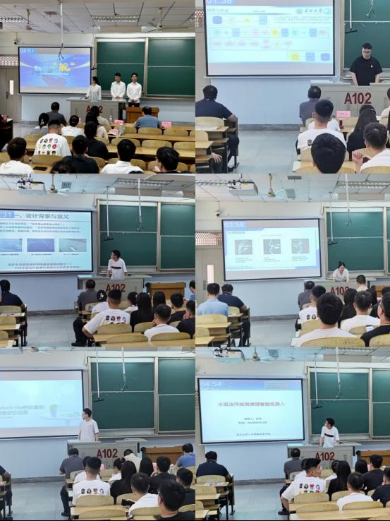 答辩现场,来自全校的20支研究生项目团队主讲人对其项目进行了PPT演讲,主要围绕项目意义、创新之处、取得成果等方面展开。各项目团队将所学人工智能理论知识结合不同领域开展技术应用探索,包括医疗健康、交通运输、农业农村以及能源生产等。根据赛事上推规则,最终确定了8个项目上推,将参加于6月22日举行的湖北省省赛。
